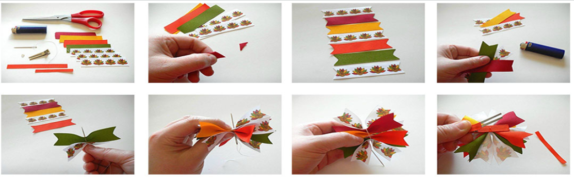 - Взять 2 отреза ленточки: длинный — для самого бантика и короткий — чтобы перевязать его. Если бант будет частью пояса, короткий отрезок подбирают по размеру талии. Часть для украшения (она может быть шире, чем другая) складывают зигзагом, формируя множество одинаковых или разных по длине складок. В последнем случае более длинные — расположены снизу, а к верхней части уменьшаются «лесенкой». Центр бантика можно закрепить степлером, булавкой, а затем перевязать его вторым отрезом ленты (ее края фигурно срезать).