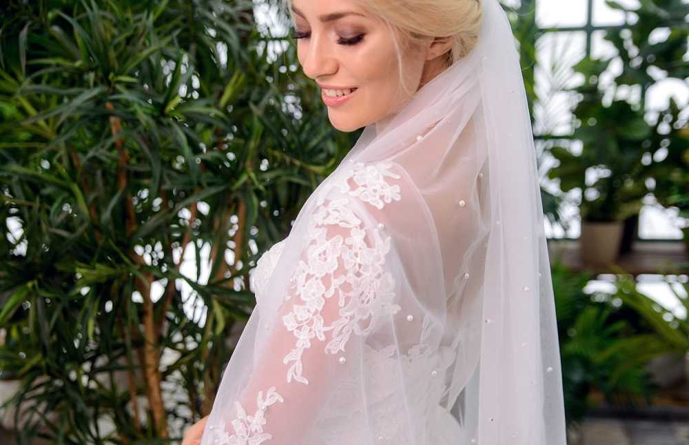 Свадебная фата с жемчугом позволяет создать волшебный образ. Белоснежные крупинки на полупрозрачной ткани можно сочетать с вышивкой и кружевной отделкой. Жемчуг эффектно смотрится как на утонченных вуалетках, так и длинных вариантах фаты. Ткань можно декорировать жемчужинами по краям или в хаотичном порядке по всей поверхности.