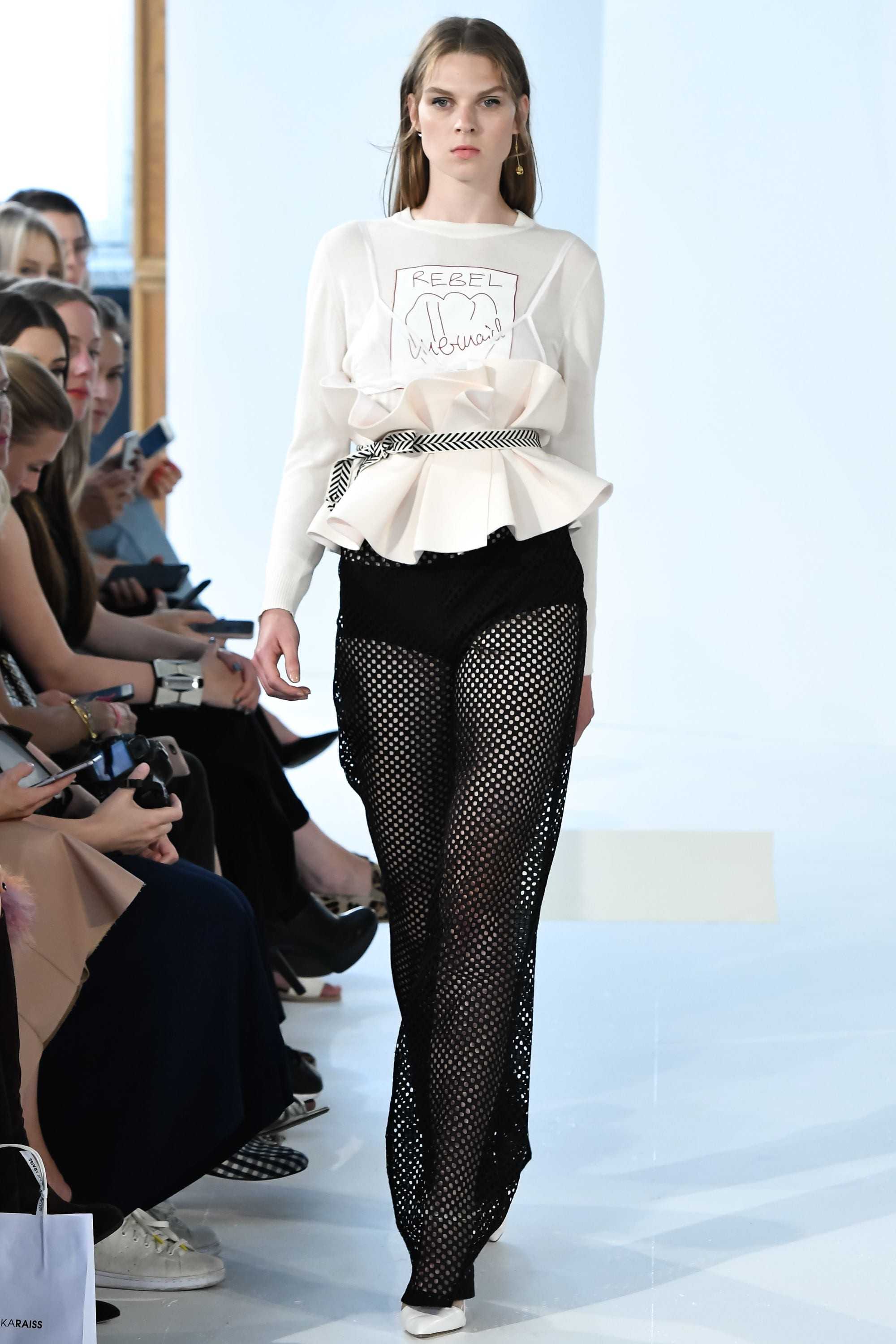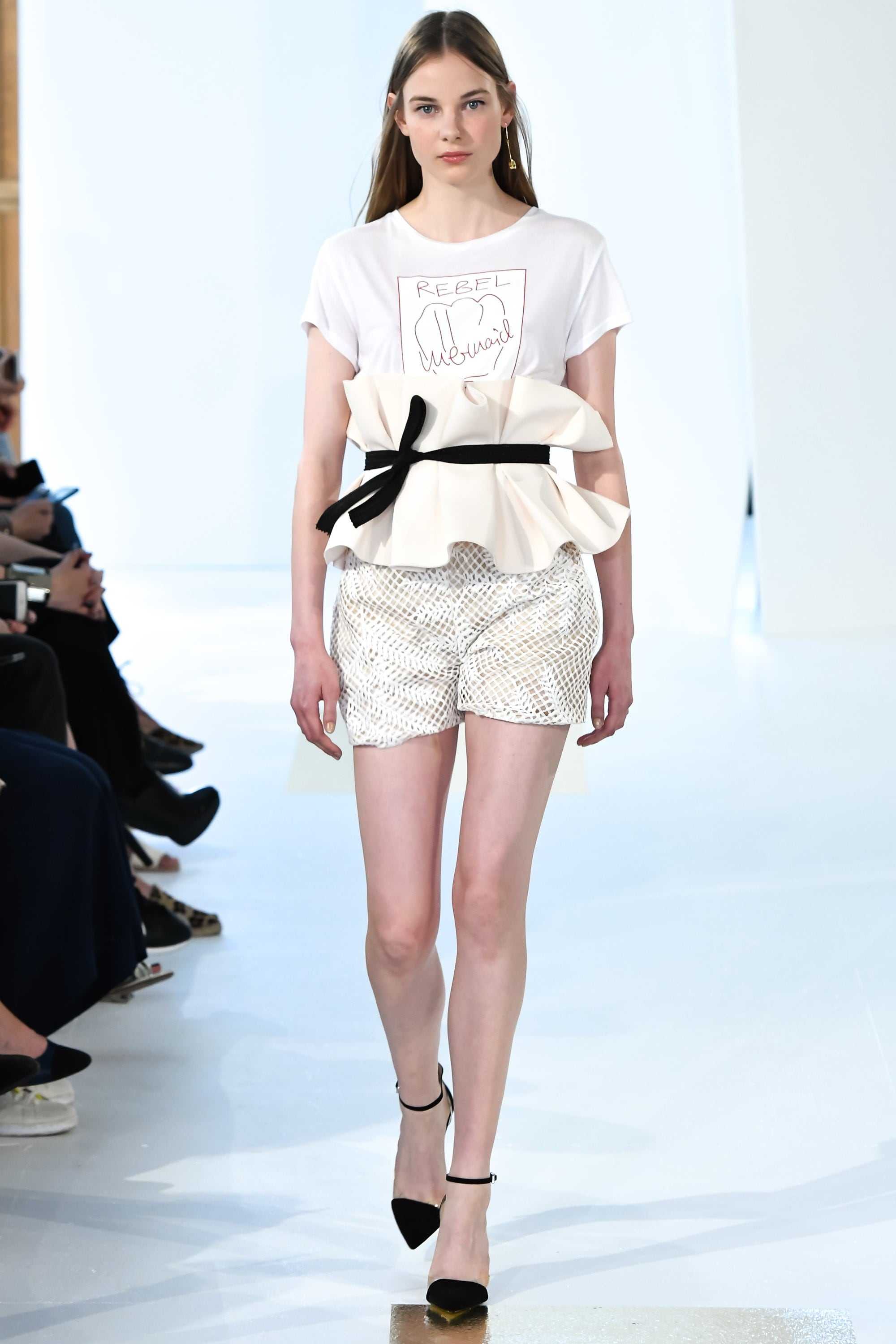 Элегантная корсетная деталь с оборками и пояском в виде изящной ленты достойно уравновешивает кэжуал лук.