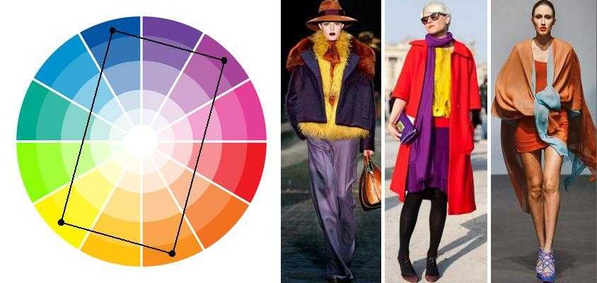 Прямоугольник — согласно геометрической фигуре прямоугольник при такой схеме выбирается не 3, а 4 цвета. Каждый из цветов является близким со вторым и комплементарным с 2 остальными