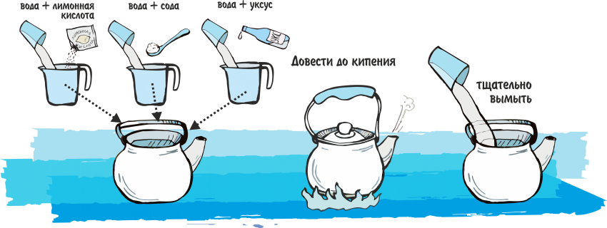 - Уксусный раствор удаляется, а чайник тщательно промывается. Неприятный запах уходит после длительного проветривания.