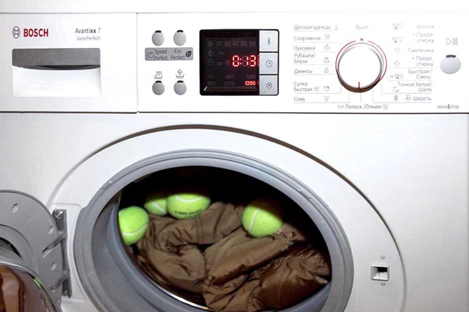 - Поместите изделие в барабан агрегата. Положите внутрь теннисные шарики или специальные, для разбивания пуха (продаются в магазинах бытовой химии или хозяйственных).