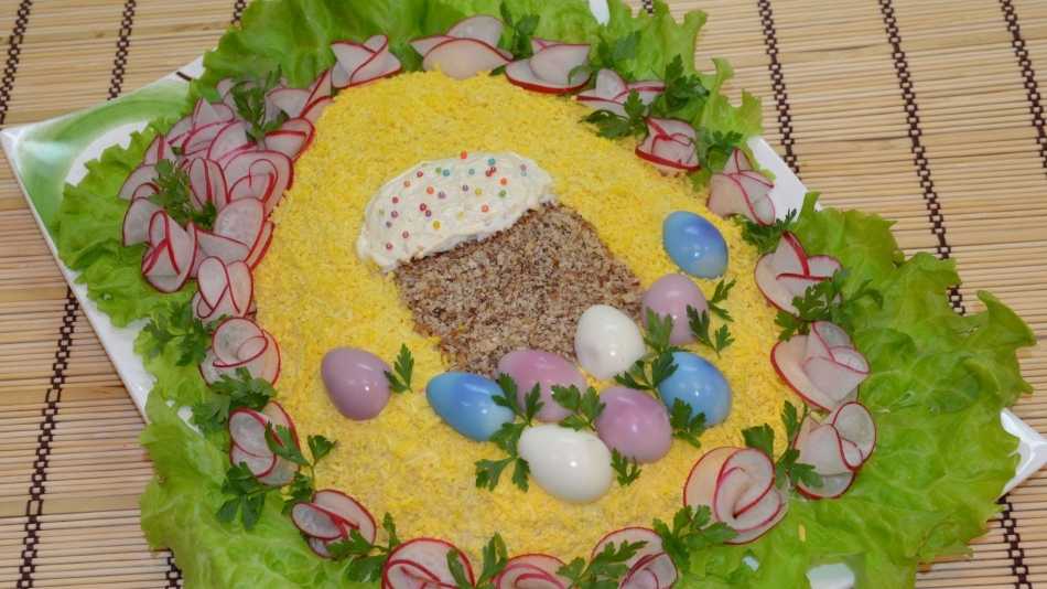 салат на Пасху, украшенный половинками крашеных пищевым красителем перепелиных яиц![]()