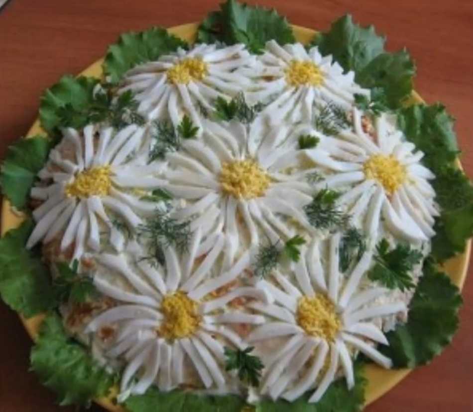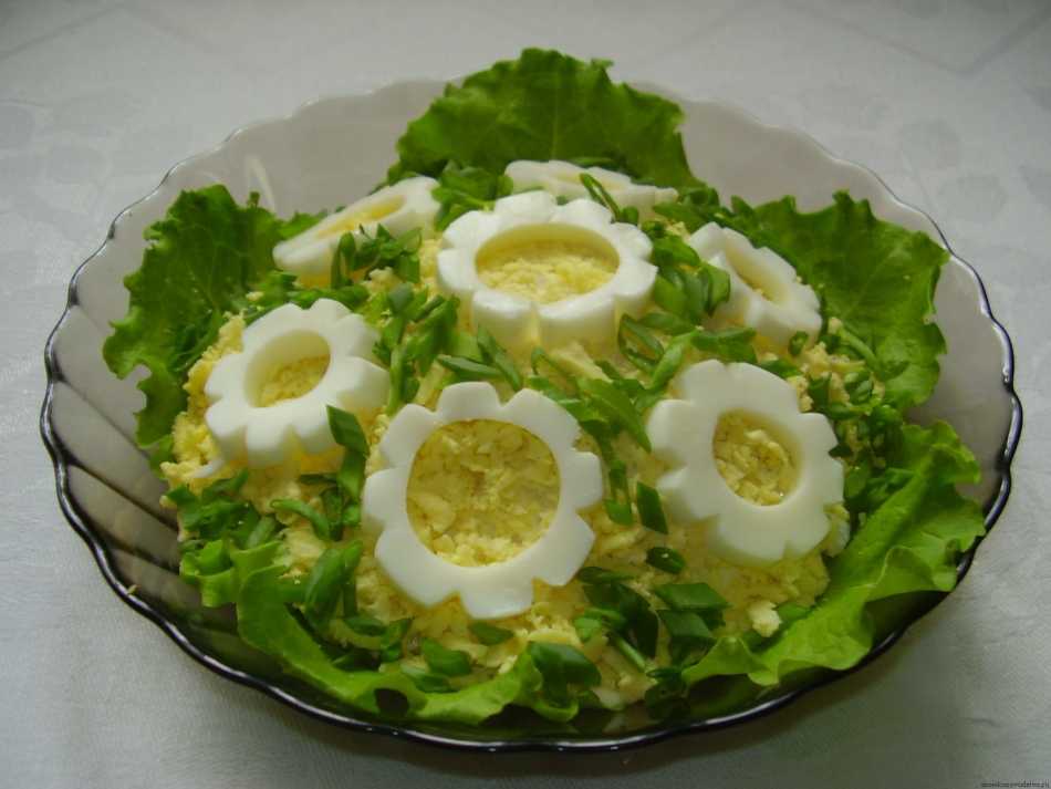 Один из самых обычных способов предполагает вырезание из белка лепестков цветков и создания серединки из тертого желтка. Такими цветками можно украсить «Мимозу» и любой другой салат ,в составе которого есть яйца.
