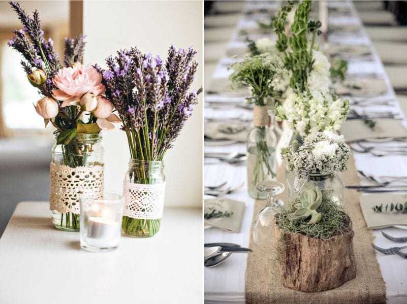 - Вазы можно сделать из бутылок, консервных и стеклянных банок, задекорированных кружевом, мешковиной, краской, лентами, джутом и пр. Фото-примеры такого декора представлены ниже.