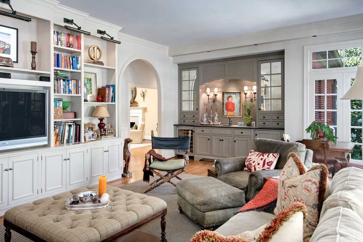 На фото классический пример американского интерьера в частном доме с нишами, обилием светильников, стекла и мебели в английском стиле.