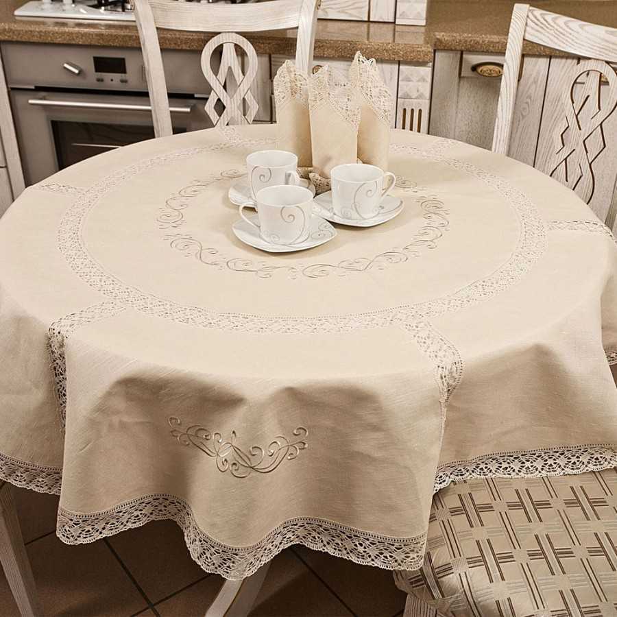 Скатерть должна совпадать со столешницей по форме. Или нижнее покрытие (юбка) соответствовать форме и размеру, а верхнее декоративное, располагаться согласно замыслу хозяйки.