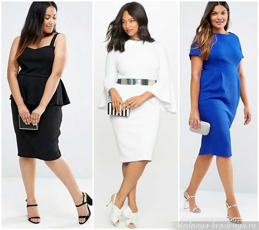 Иное дело – платье-футляр, мягко облегающее фигуру. Модель эта сдержанная, цельнокройная, силуэт не делится на лиф и юбку, нет подчеркивания талии, линии бедер. Платье-футляр для полных может быть с рукавом любой длины, в зависимости от фасона. Вечерний вариант возможен с фигурным декольте, легким ниспадающим рукавом и минимумом украшений. Строгий стиль футляра приобретает торжественность, загадочность с кружевным чехлом, в сочетании с высоким каблучком, элегантной сумочкой-клатчем.