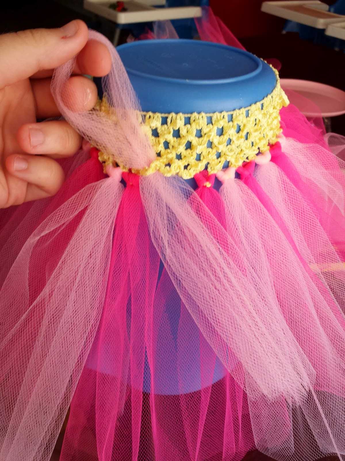 Пышную юбку обрабатывают по краю собственно-созданными рюшами, которые можно сделать из нейлоновой сетки.