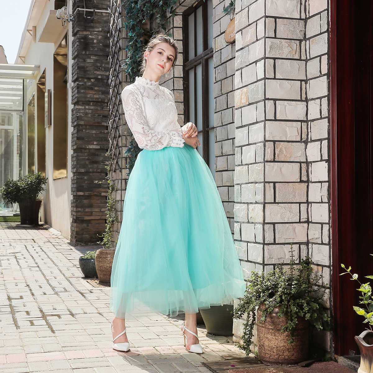 Длина макси не первый год сохраняет лидирующие позиции. Не стоит ломать голову, с чем носить длинную юбку-пачку. С ней гармонируют как соблазнительные открытые блузы, так и более скромные закрытые футболки. Для вечернего наряда можно выбрать обувь на каблуке, а для повседневного лука — кроссовки или ботинки. Сетки ниже колена допустимо надевать в прохладную погоду, чтобы освежить осенний или даже зимний образ. В сочетании с высокими сапогами они смотрятся очень эффектно.