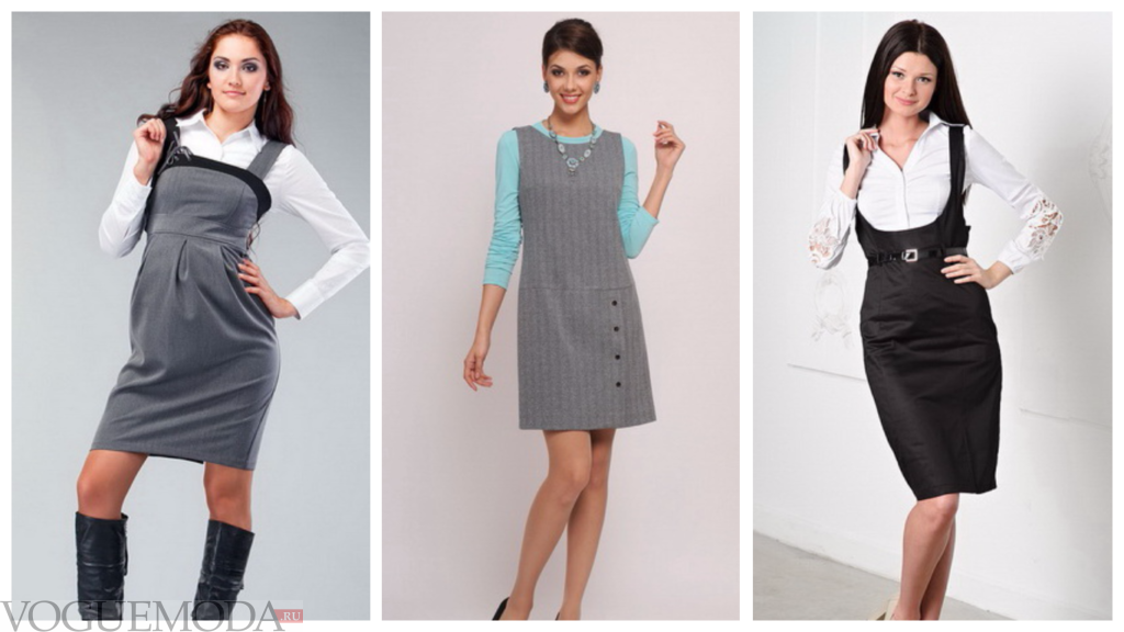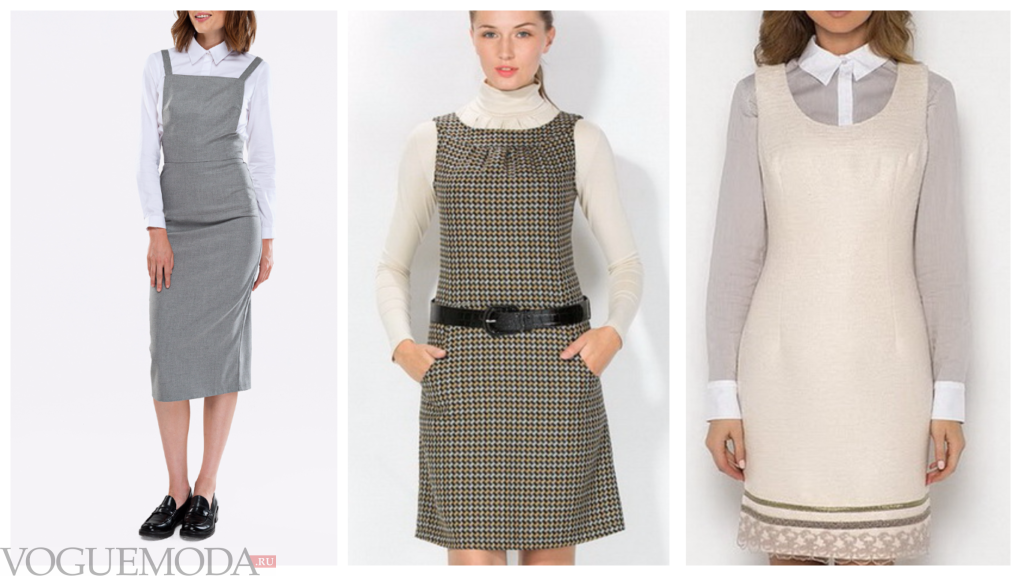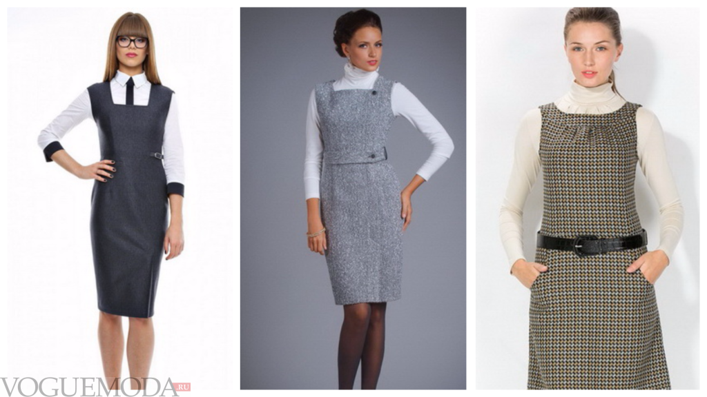 Фасоны, которые будут актуальны для девочек младшего школьного возраста: теплые сарафаны, классические платья средней длины, юбки с жакетами чуть ниже линии талии. Примеры в фото: