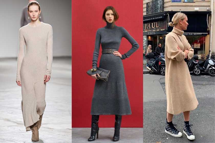 Сегодня популярны не только объемные оверсайз модели, но и приталенные с подчеркнутой талией и расклешенной юбкой. Платье, полностью обтягивающее силуэт от груди до щиколотки – не актуально. При выборе отталкиваемся от особенностей своей фигуры. Если у вас идеальные пропорции – то приталенное подчеркнет все ваши достоинства. Если же имеются нюансы – выберите свободное платье. Некоторые модели идут с воротником-стойкой — удобный вариант для тех, кто не любит шарфы, но при этом носит пальто и шубы с V-вырезом. Главное, не выбирать воротник-хомут, он сейчас не в моде.