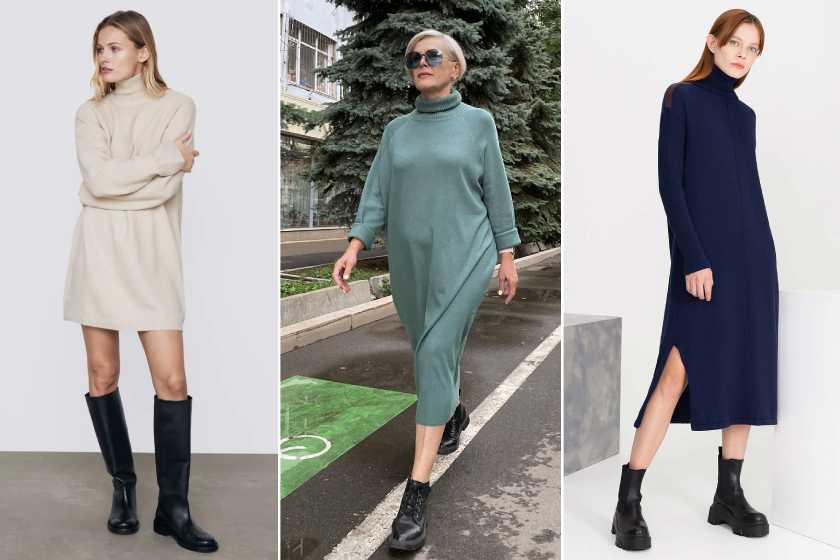 Подобное платье эффектно смотрится с собранной вверх прической, массивными длинными серьгами и высокими ботинками или утонченными сапожками.
