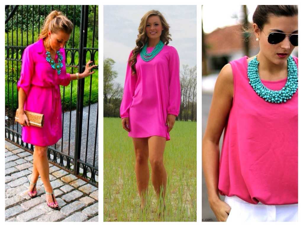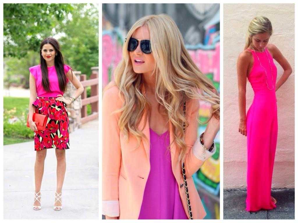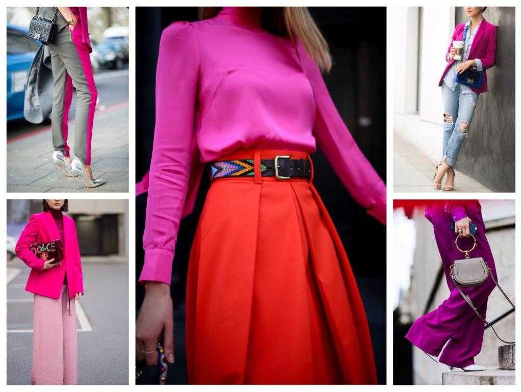 Истинная фуксия без смешения тонов, в отличие от розовой, имеет в своей основе холодный синеватый подтон. Поэтому, подбирая комплект, помни о теплой и холодной цветовой гамме. Смешивать их в одном образе нежелательно и слишком сложно, поскольку придется подумать о фактурах, способных уравновесить диссонанс.