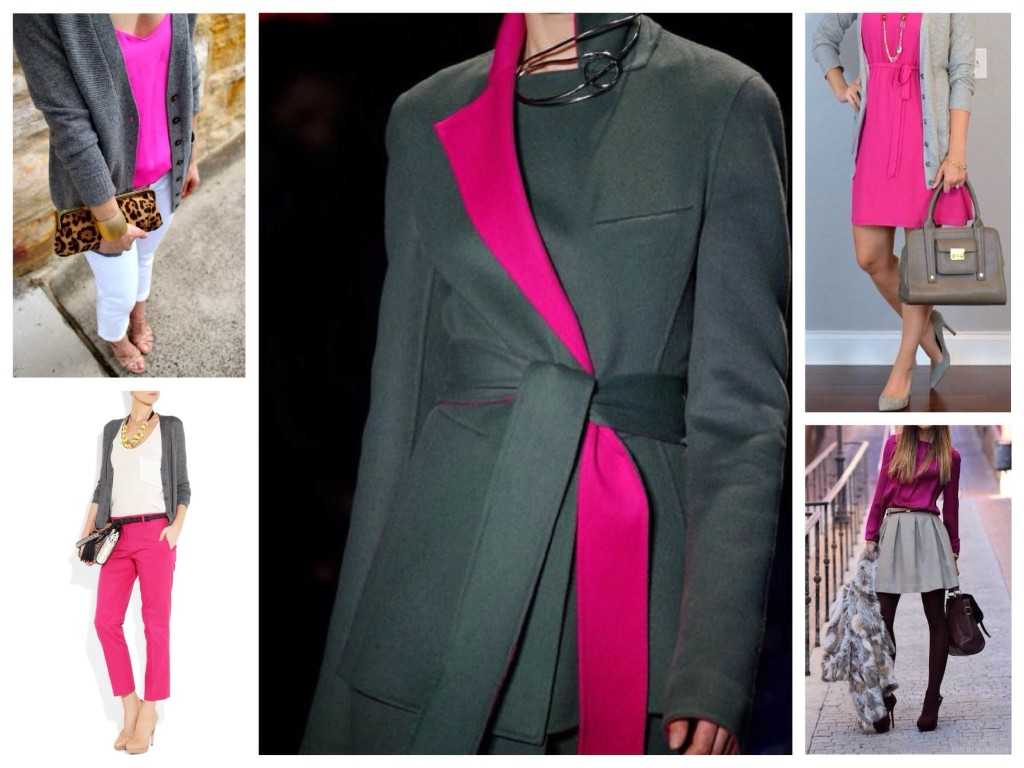 - Фуксия с серым кажется удачной комбинацией за счет того, что спокойный оттенок уравновешивает образ, делает его менее кричащим. Лучший вариант – яркий верх и серый сдержанный низ.