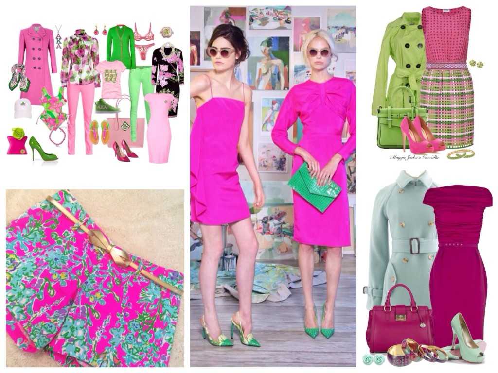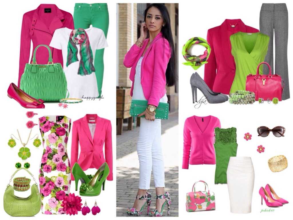 Такую комбинацию диктует сама природа! Стоит лишь вспомнить, какой восторг и трепет вызывает одноименный цветок, когда расцветает на фоне зеленых листьев. Если вы выбрали лаконичное платье цвета фуксии, то подберите к ним туфли и сумку светлого зеленого тона, как на фото. Отметим, что к изумрудному наряду очень идут аксессуары цвета темной фуксии.