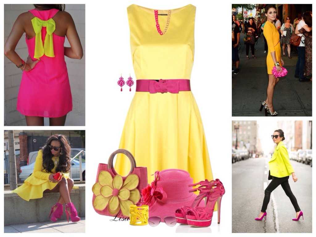 Модницы могут носить вместе яркое желтое платье и туфли яркого розового оттенка. Но помните, что такая комбинация смотрится уместно только в молодом возрасте. Более взрослым дамам лучше избегать подобного смелого сочетания и больше следовать классике.