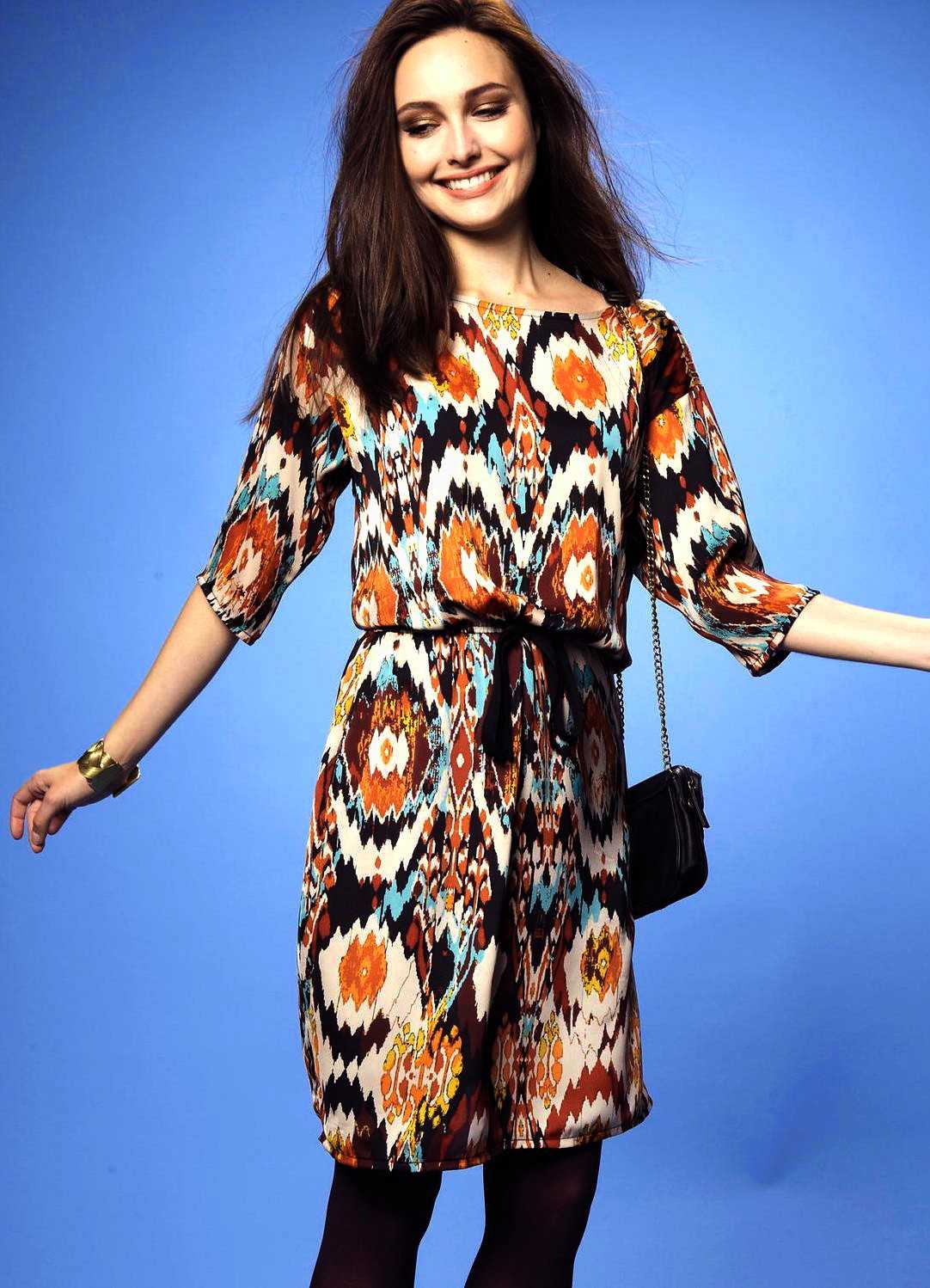 Платье в этническом стиле, приталенного фасона, длиной выше колен, на лямках хорошо смотрится с короткой курткой оттенка мокрый асфальт, с укороченными рукавами, небольшой сумкой и босоножками на низком ходу.