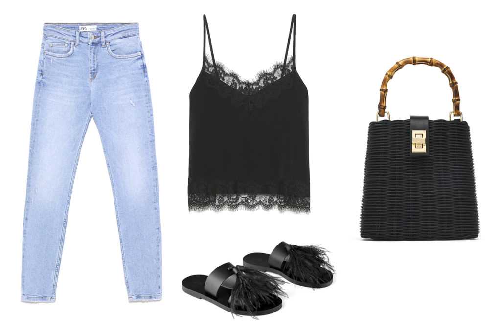 Идеальный лук для прогулки по летнему городу и любых будничных дел – сочетание топа в пижамном стиле и винтажных джинсов-скинни. Такой наряд не только смотрится стильно, но и обеспечивает своей обладательнице ощущение максимального комфорта. В качестве обуви предлагаем выбрать кожаные сандалии с отделкой из перьев, а также завершить образ модной плетеной сумкой. Если в итоге наряд кажется вам слишком простым и вы хотите его разнообразить, добавьте композицию из золотых подвесок или массивные серьги. Также на плечи можно набросить джинсовую куртку, поиграв с многослойностью.