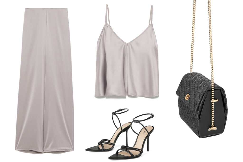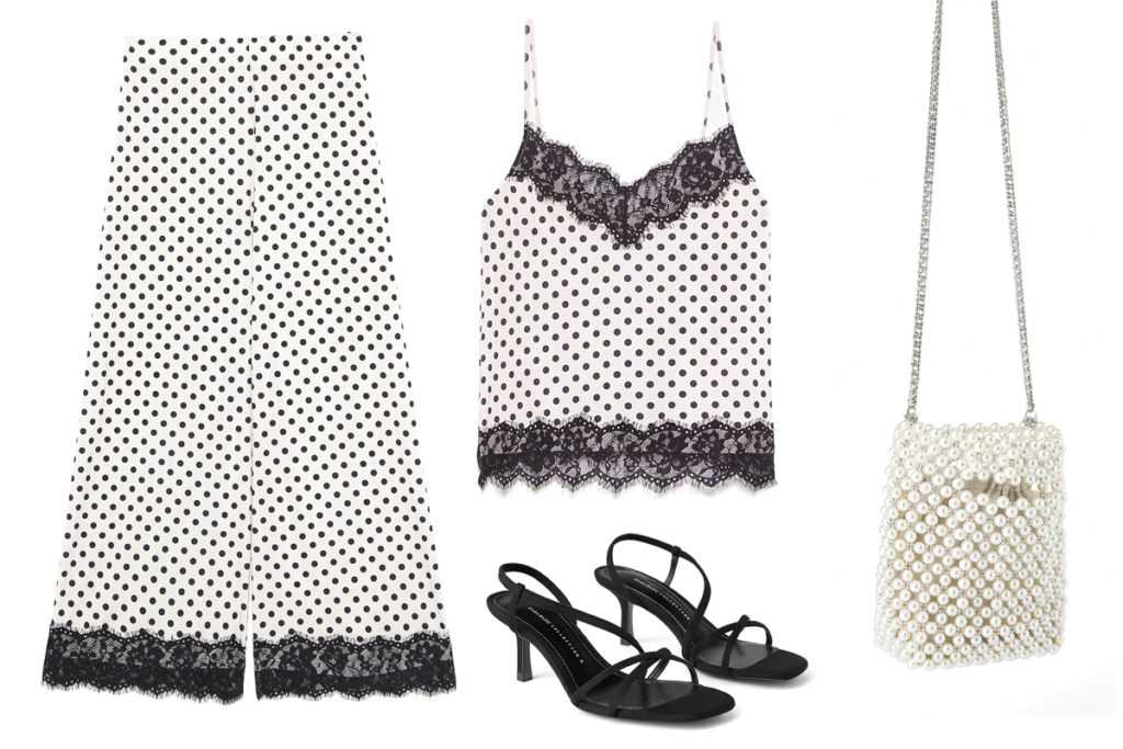 Комплект в пижамном стиле, состоящий из атласных кюлот и топа на бретельках в мелкий горошек – идеальный выбор для вечеринки. Дополните наряд актуальными в этом сезоне босоножками на шпильке с тонкими ремешками и сумочкой с жемчужным декором. В прохладную погоду завершить наряд поможет удлиненный черный блейзер в официальном стиле. Кроме того, чтобы наряд смотрелся более торжественно вы можете добавить к нему пару заметных украшений и сделать яркий макияж с акцентом на губы. В результате получится стильный и элегантный образ с налетом парижского шика.