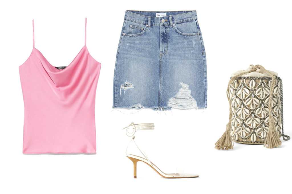 Для воскресного бранча с подругами выберите этот наряд, в котором гармонично сочетаются дерзкая джинсовая юбка-мини и нежный шелковый топ на тонких бретелях. Дополнить наряд, сделав его элегантным и небанальным помогут стильные белые босоножки на каблуке и цилиндрическая сумка из натуральных материалов с оригинальным декором. Учитывая, что главным элементом этого наряда является яркий бельевой топ, макияж лучше оставить сдержанным, а украшения – нейтральными.