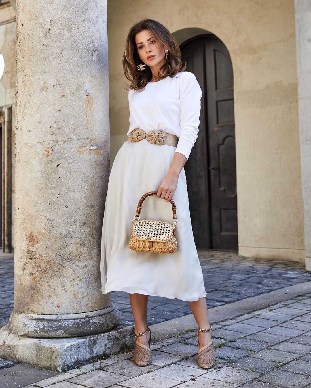 Позаботьтесь, чтобы у вас в шкафу была обязательно белая футболка, трикотажный свитшот или джемпер в однотонном исполнении, либо вязаный свитерок из легкой вязки в опять же базовых оттенках, что можно обыграть многослойностью в тандеме с белой рубашкой.