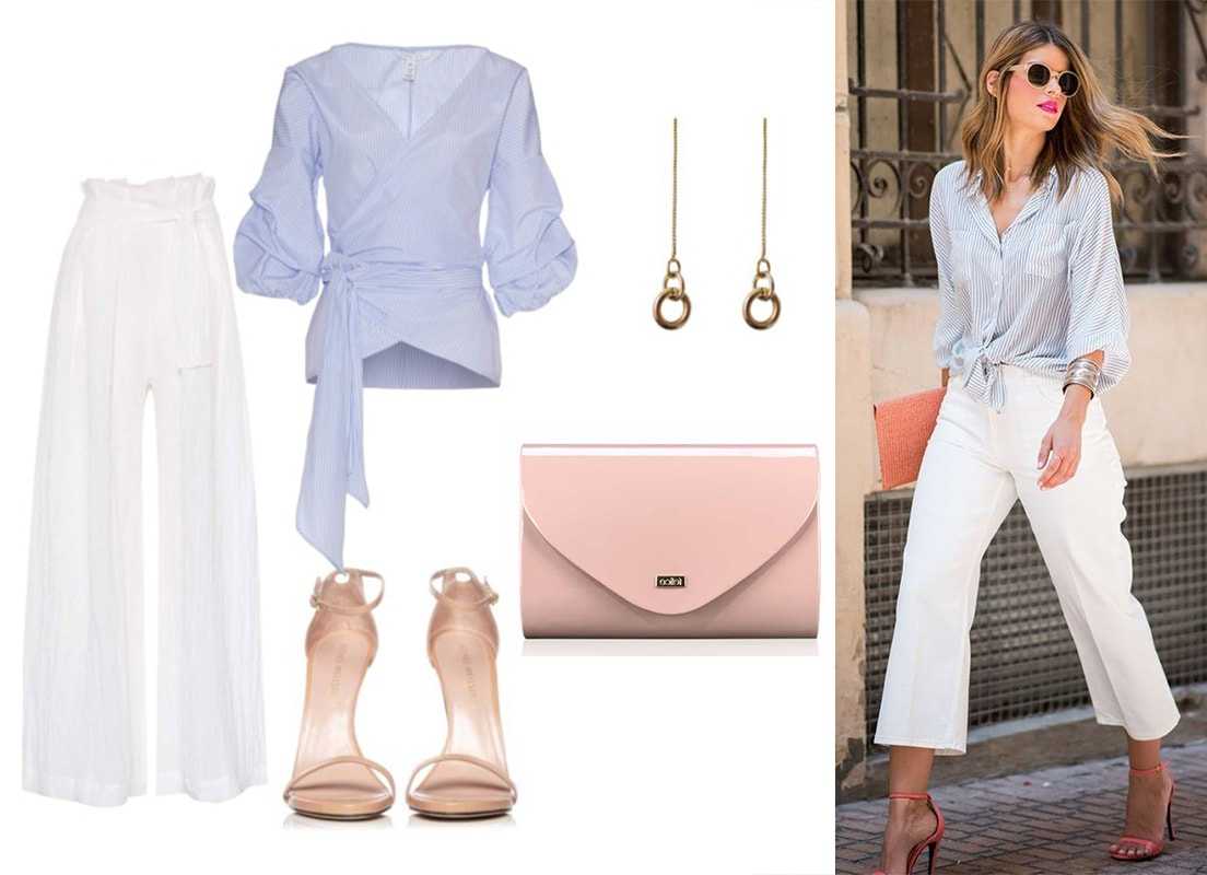 В качестве низа рекомендуем приобрести брюки с высокой посадкой по щиколотку, юбки, платья средней длины миди. Рваные джинсы голубого цвета с ярким декором абсолютно неуместны для базового гардероба в стиле смарт casual.