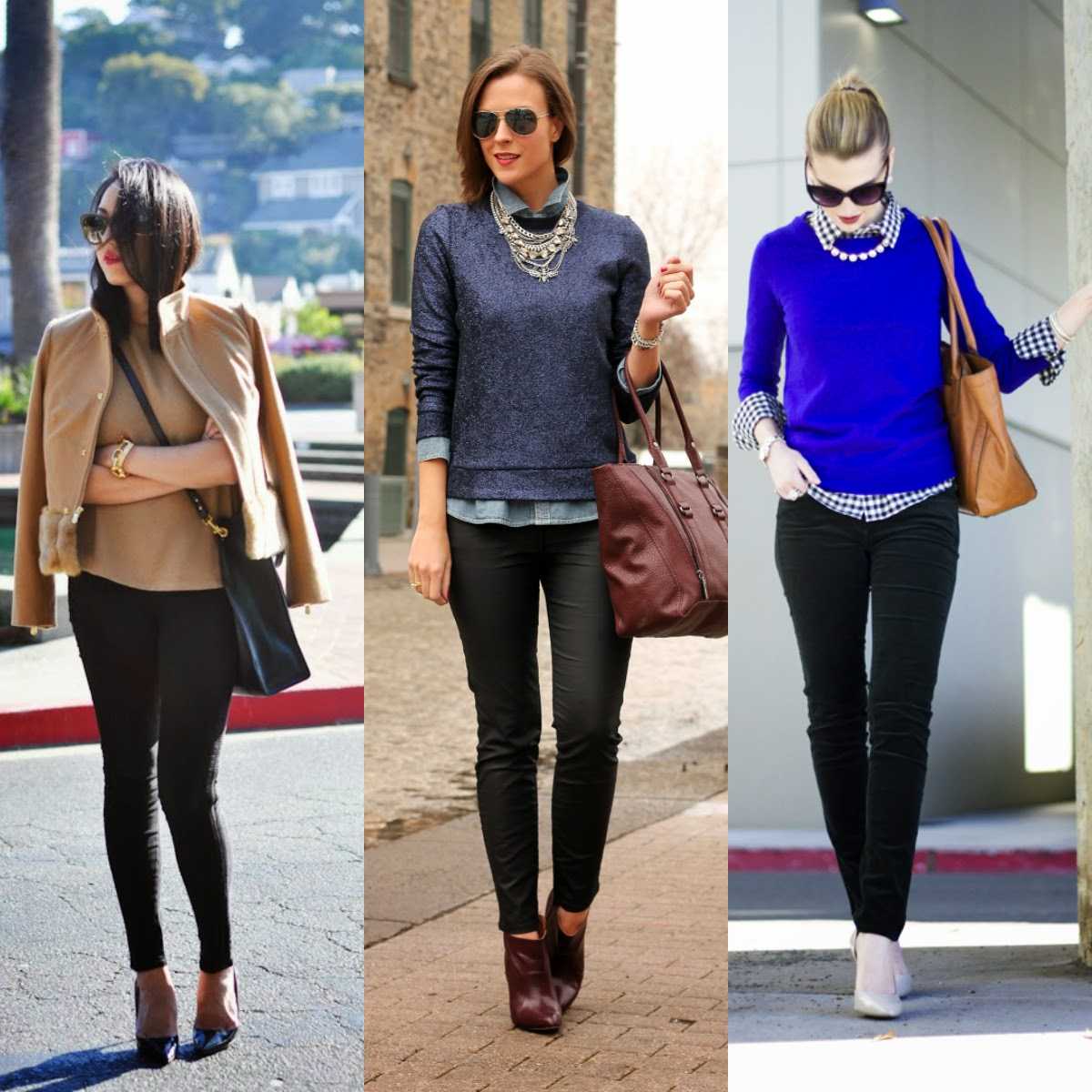 - наиболее подходящим вариантом для верхней части одежды служит белая блузка летом и стильный свитер для холодного времени года;