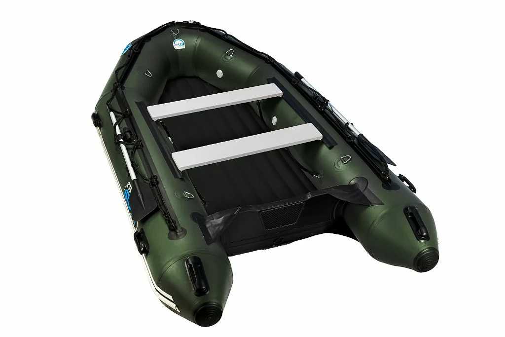 Эта вместительная 3-местная надувная лодка позволяет без труда совершать долгие водные переправы, рыбачить или идти на охоту. Она имеет 3 отдельных гермоотсека, между которыми натянут каркас, выполненный в форме мешка, что максимально повышает безопасность пассажиров. Судно останется на плаву, если один или два отсека повреждены. Материал корпуса ПВХ имеет плотность 1100 г/м2 и настолько прочен, что способен выдерживать столкновения с серьезными препятствиями. При этом само изделие весит всего 28 кг.