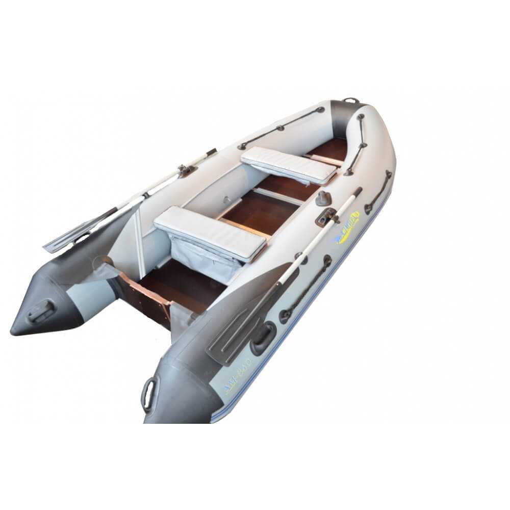 Судно включает в себя 3 надувных отдела, что гарантирует высокую безопасность в ситуации проколов. Транец вклеивается в корпус посредством усилителя транцхолдера. В комплектации также поставляется разборный пайол – жесткая съемная поверхность, которая обеспечит комфорт при передвижении людей по плавсредству.