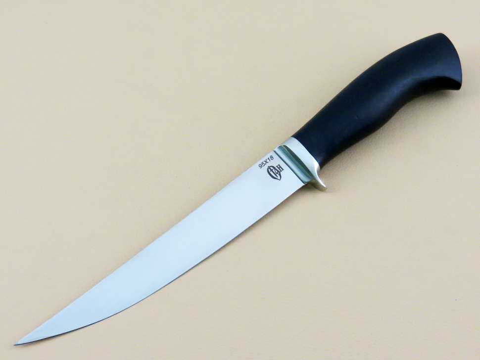 Это небольшой клинок, очень лёгкий, имеет классическую довольно узкую форму лезвия. Изготавливается из стали марки 100X13М. Рукоять очень удобная и эргономичная, позволяет легко потрошить рыбу различных размеров и разделывать водоплавающую дичь.
