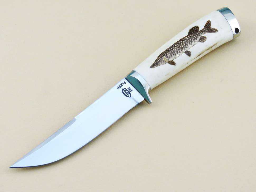 Этот нож средних размеров, относительно лёгкий, но очень прочный. Полотно выполняется из стали марки 95х18. Обладает очень острым лезвием, предназначенным для вспарывания улова любого размера.