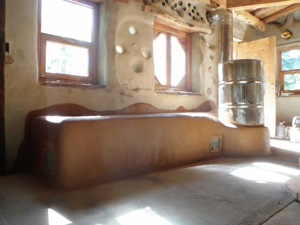 Такая печь довольно экономичная в использовании, так как в ней происходит сжигание не только дров, но и пиролизных газов. Дымоходный канал печи иногда не выводят из помещения сразу, а проводят внутри лежанки, сделанной из кирпича и/или глины. Такая лежанка нагревает помещение до комфортной температуры. Сама же конструкция изготавливается из труб большого диаметра, бочки или кирпича.