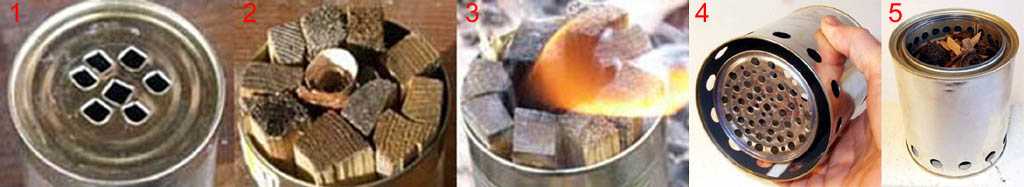 Если среди порожних банок есть пара, входящих одна в другую, то из банок возможно быстро собрать более экономичную и пригодную для варки чая или супа в кружке щепочницу со смешанным режимом горения, поз. 4 и 5. Отверстия, разумеется, не обязательно должны быть такими аккуратными, их можно просто пробить ножом. Если печка будет загружаться рыхлым топливом, дырки во внутренней банке нужно протыкать изнутри, чтобы заусенцы не мешали загрузке. Также в обечайке (цилиндрической боковине) внутренней банки отверстий пробивается 1-3 ряда вверху. Веточное топливо загружается до нижнего края отверстий верхнего ряда, поз. 5. Это, конечно, не все варианты печек-щепочниц на крайний случай; возможны и другие вполне эффективные конструкции походных печей из банок, см. напр. видео: