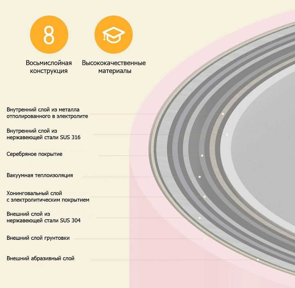 Возможность сохранять тепло на протяжении длительного времени. Достичь такого результата удалось благодаря использованию нескольких слоев для сохранности температуры, благодаря чему изменения не могут превышать 2 градусов в час.