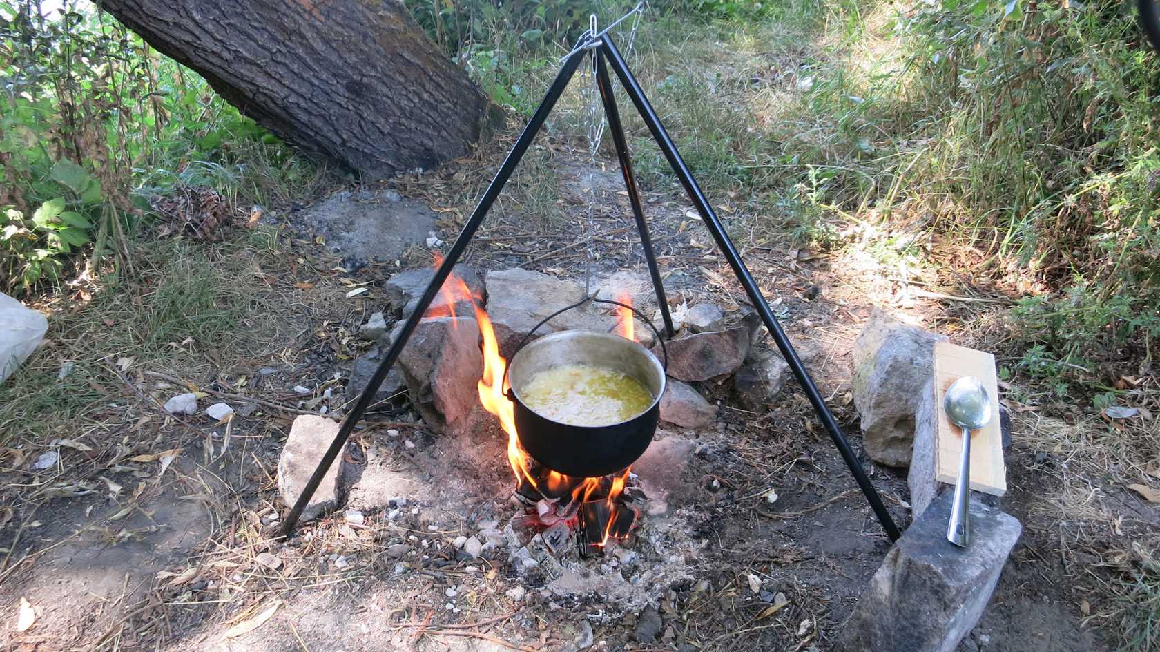 Как подвесить котелок над костром, если едоков много