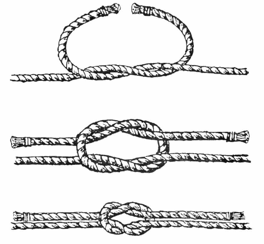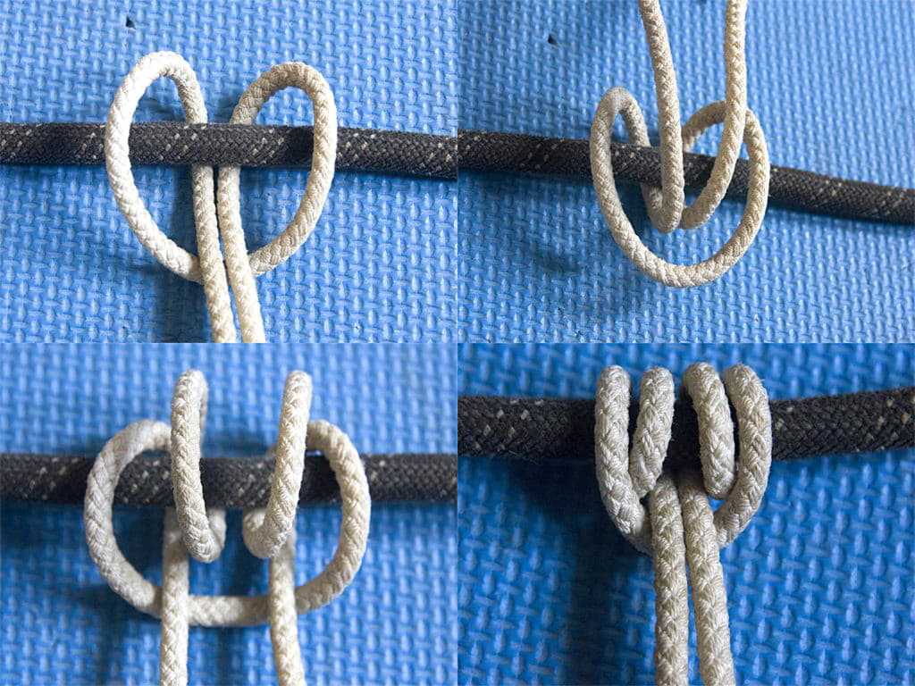 - Две веревки накладываются друг на друга и завязываются два простых узла. Важный момент — оба узла должны быть завязаны одинаково, иначе получится совсем другой, который не отличается прочностью и легко развязывается под нагрузкой.