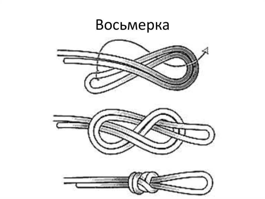 Использование узла «восьмерка» зависит от того какую вид вы выберете — обычную, проводник, встречную. Классический вариант используется как концевой ограничитель. Плюсы — легко развязывается после использования. Способ вязки: Одна веревка складывается вдвое, петлей обводится вокруг себя и через петлю в основании.