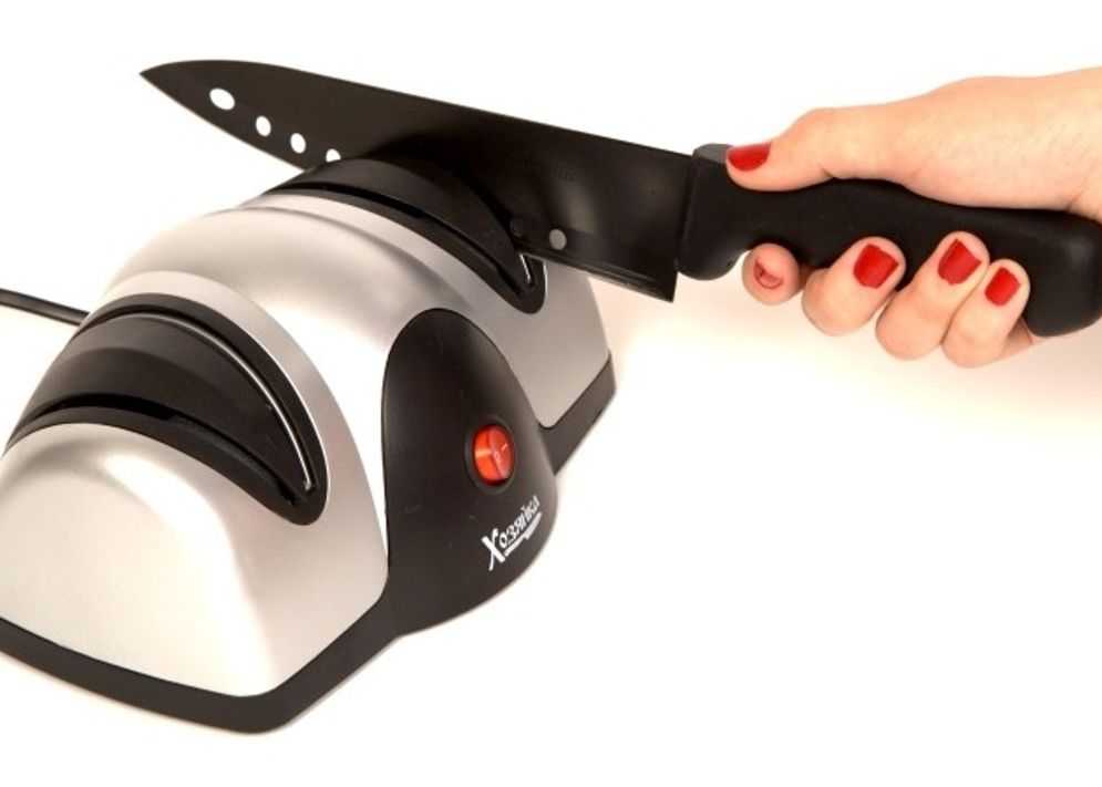- Подключите электроточилку и поместите лезвие ножа в специальную прорезь.