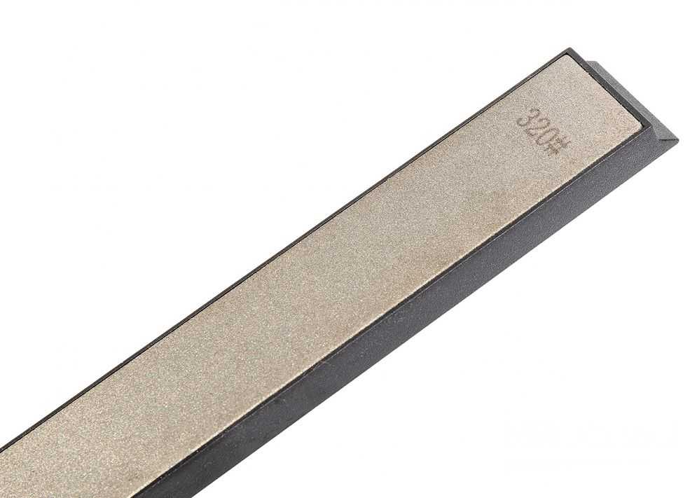 Ещё один хороший вариант — использовать алмазный стержень для заточки. Это длинный стержень с алмазным напылением, около 12 дюймов с рукоятью на одном конце. Алмазные заточные стержни очень эффективны при заточки не сильно затупившейся кромки и одинаково подходят как для стальных, так и для керамических ножей. Однако эффективность мусата всё же ниже, чем у точильного камня. Принцип действия такой же: лезвие прислоняется к стержню и безотрывно перемещается вверх и вниз от рукояти до кончика ножа.