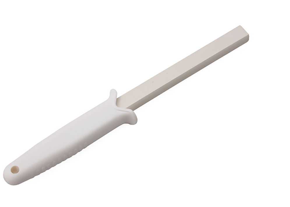 Мусат, или правило – представляет собой шпагообразный стержень с ручкой. Поверхность инструмента может быть металлической, керамической или с напылением. Встречаются даже алмазные мусаты (разумеется, речь идет об алмазной крошке).