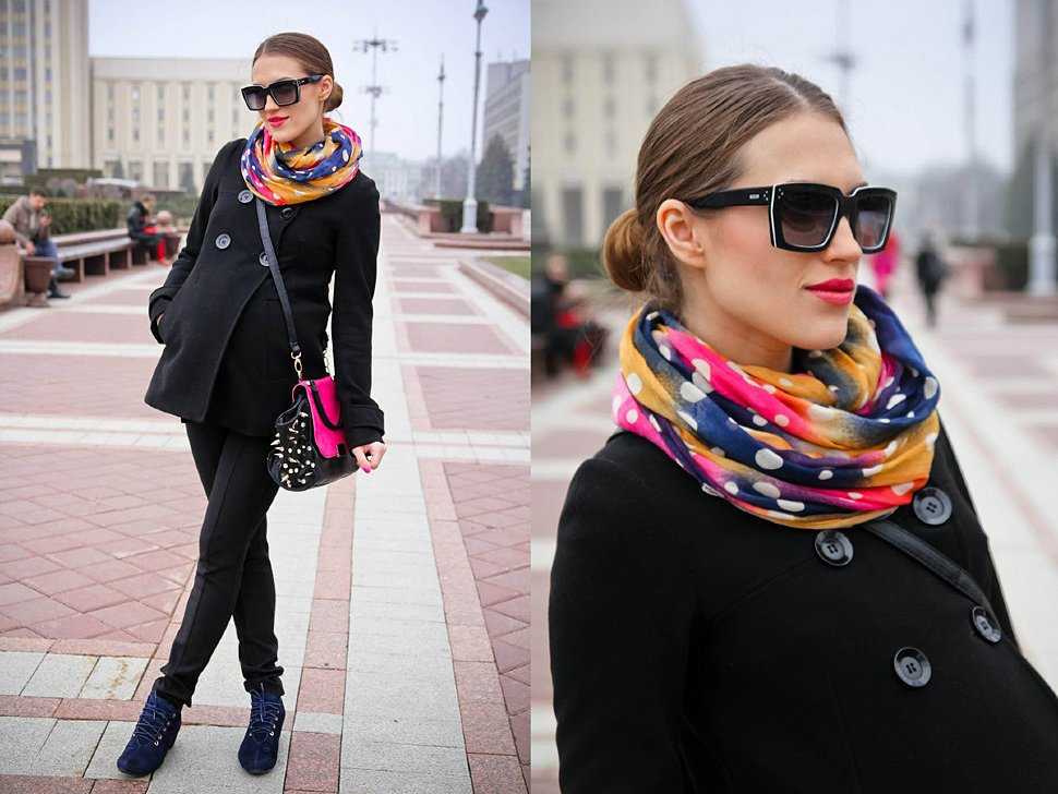 Универсальный городской шик – шарф под черное пальто, ведь данный цвет верхней одежды позволяет подобрать аксессуар любого оттенка, от пастели до яркого радужного спектра, в зависимости от личных предпочтений, и даже тон в тон, и расцветки. На взлете шарфики в клетку, полоску, с растительными и цветочными орнаментами, хищными принтами и узорной крупной вязки. Броско – трехцветный шарфик, хаотично завязанный поверх пальто, элегантно: