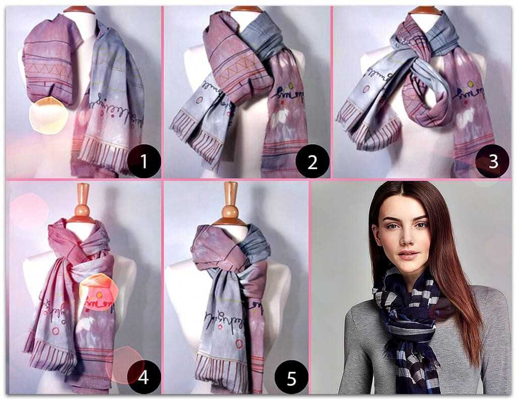 Самые популярные оригинальные варианты, как красиво завязать шарф на шее поверх демисезонной куртки, представлены в пошаговых фото:
