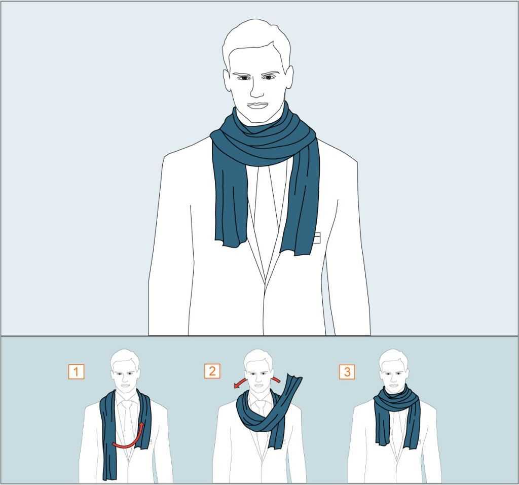 Также среди мужских вариантов довольно часто встречается самая популярная вариация носить шарф: накинуть его на шею и оставить концы свободно лежать на груди. Этот способ хорош для того, чтобы носить поверх пальто или даже куртки.