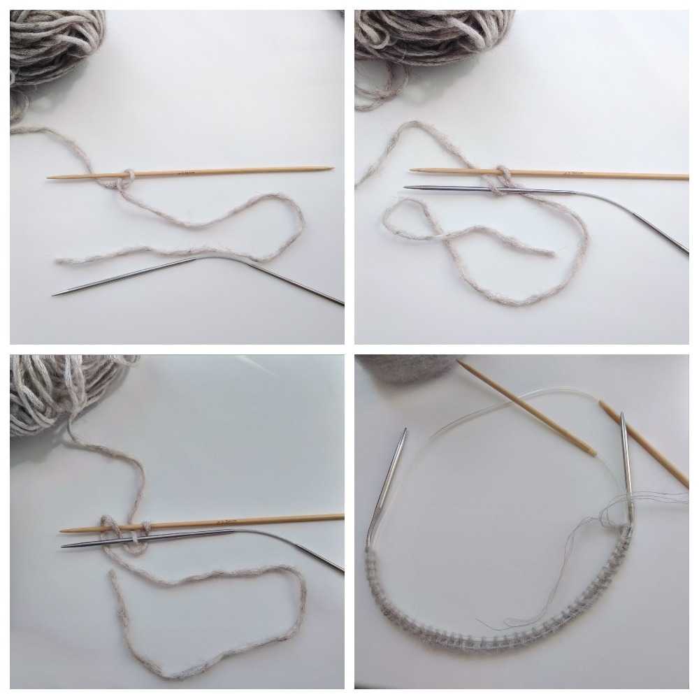 - Наберите нужное количество петель и равномерно распределите их по четырем спицам.