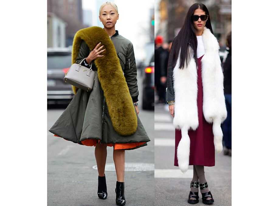 Шарфы из искусственного меха в сочетании с кожаной курткой-косухой и вязаным платьем