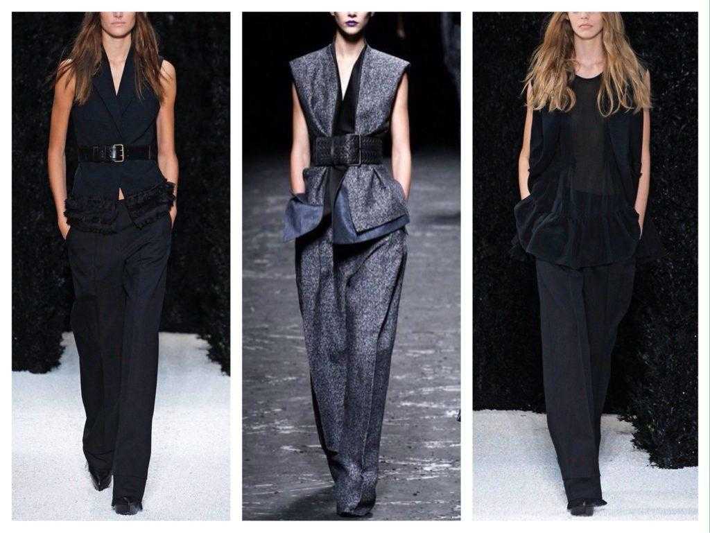 Впоследствии, когда «спинку» стали шить из такого же материала, как и переднюю часть, вариант брюки — рубашка — жилетка, стал самостоятельным комплексом. Он может предполагать то, что брюки и жилет выполнены из одинакового материала по цвету, так и создавать контраст между собой. В этом случае для жилетки выбирайте принты с вертикальными полосами, крупной клеткой или абстрактными, геометрическими узорами.