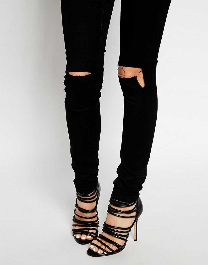 скинни идеально смотрятся на всех стройных девушках, дыры могут быть выполнены на коленях и чуть выше них;