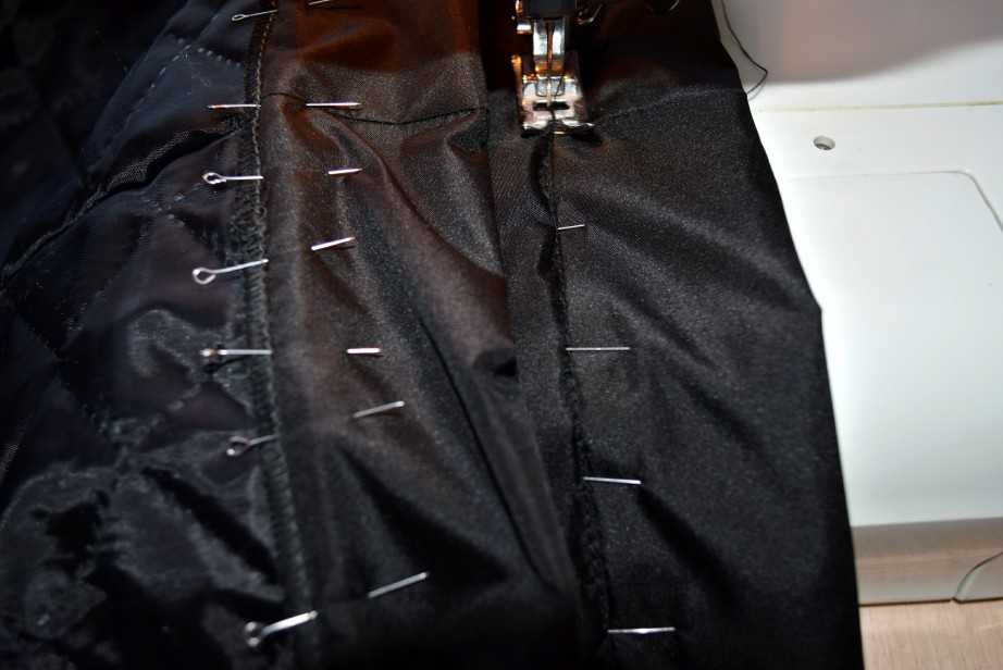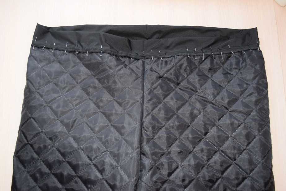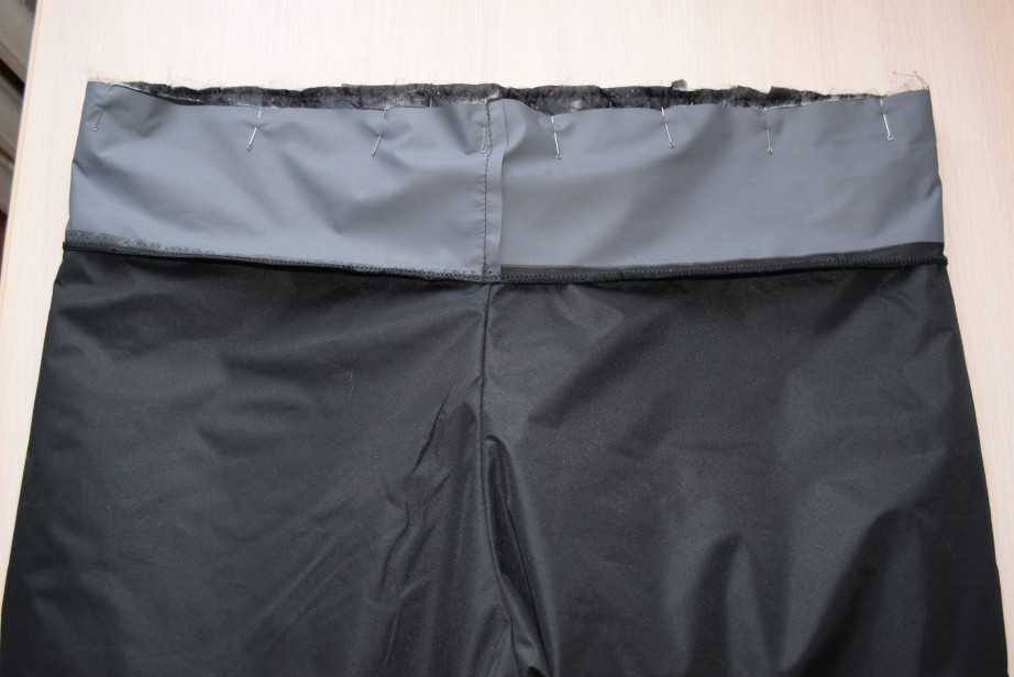 8. Накладываю пояс на зимние спортивные штаны и скрепляю булавками, обметанный край пояса остается снизу. Затем отступая от края на величину припуска — 1 см. делаю строчку на швейной машинке.