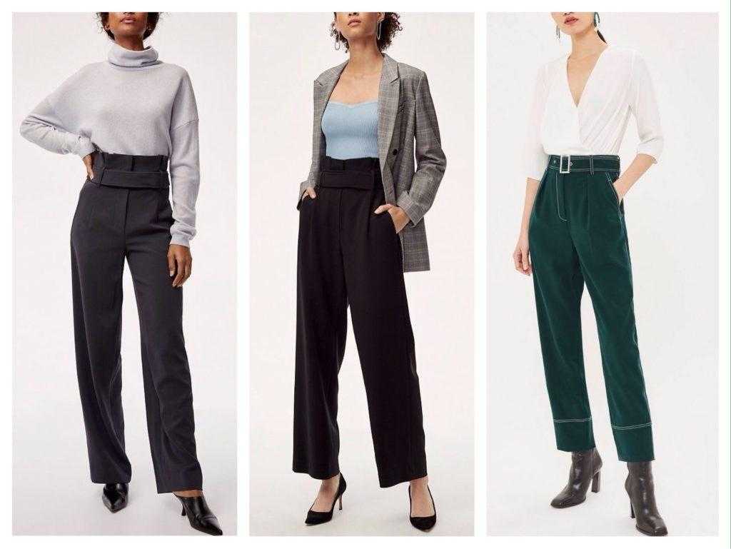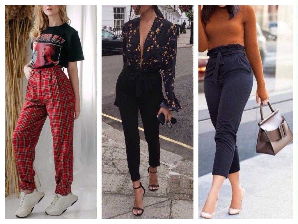 В офисе незаменимыми будут брюки с высокой талией и с поясом. Их носят с блузой, рубашкой или кофтой с баской. На прогулку такой фасон надевают с майкой, заправленной внутрь. Для вечеринки штаны комбинируют с акцентной блузой или топом.